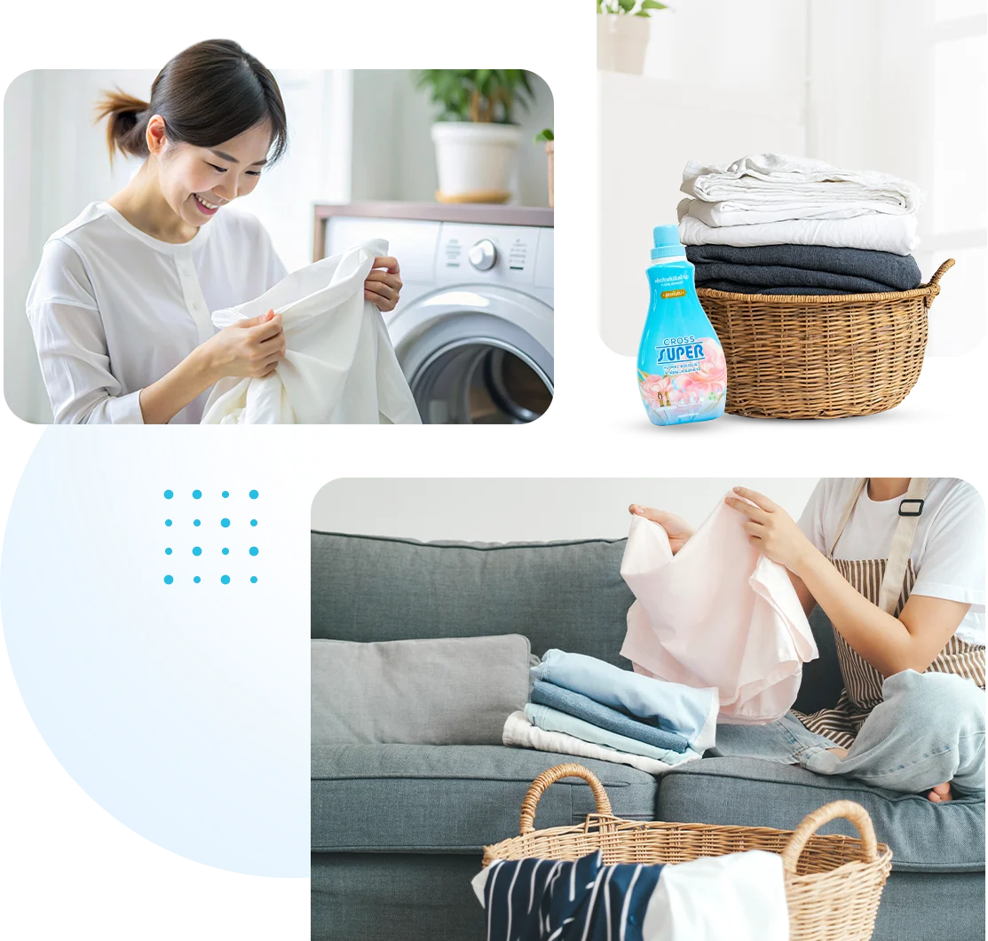 ผลิตภัณฑ์ปรับผ้านุ่มของเราช่วยดูแลเส้นใยผ้าอย่างอ่อนโยน ลดการเกิดขุยและรอยยับ